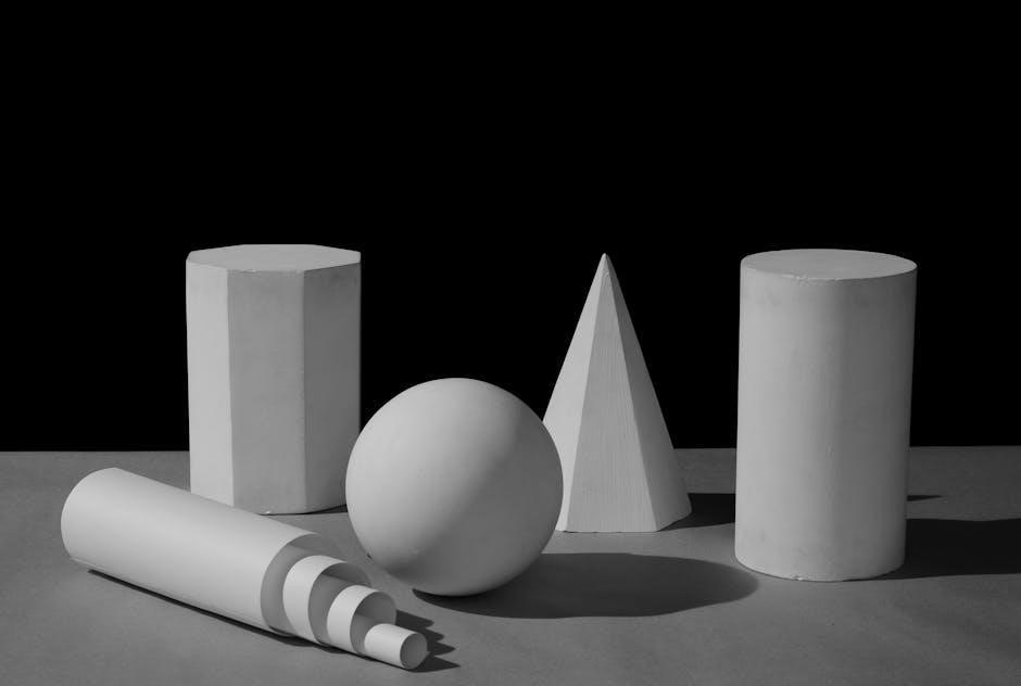 Angles are formed by two rays sharing a common endpoint (vertex). They’re categorized by their degree measure: acute (less than 90°), right (exactly 90°), obtuse (between 90° and 180°), and straight (180°). Understanding angle relationships is crucial.
